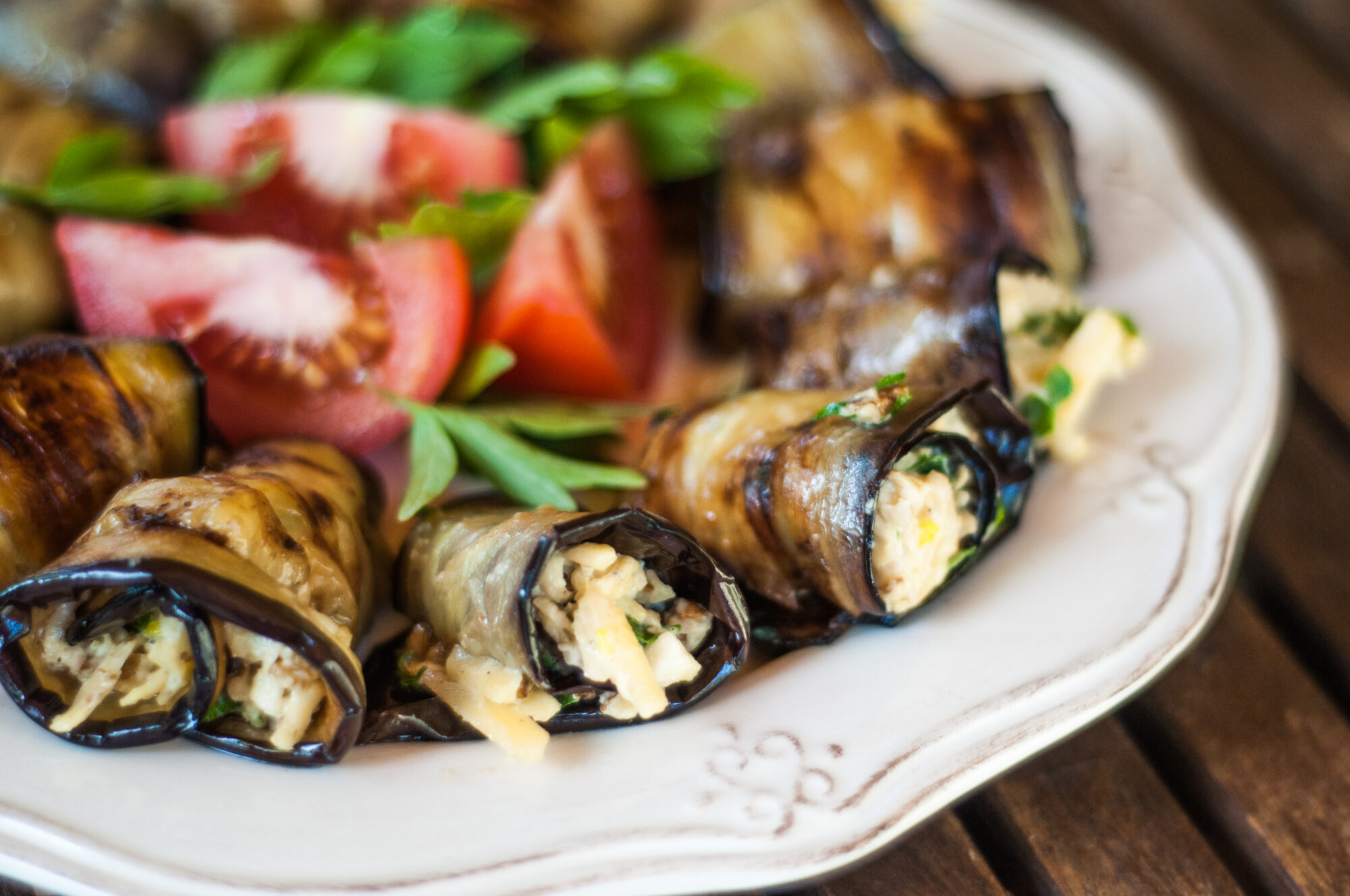 Spread one spoon of filling on one side of each eggplant slice. Roll it to enclose the filling. Proceed in the same way with each slice.