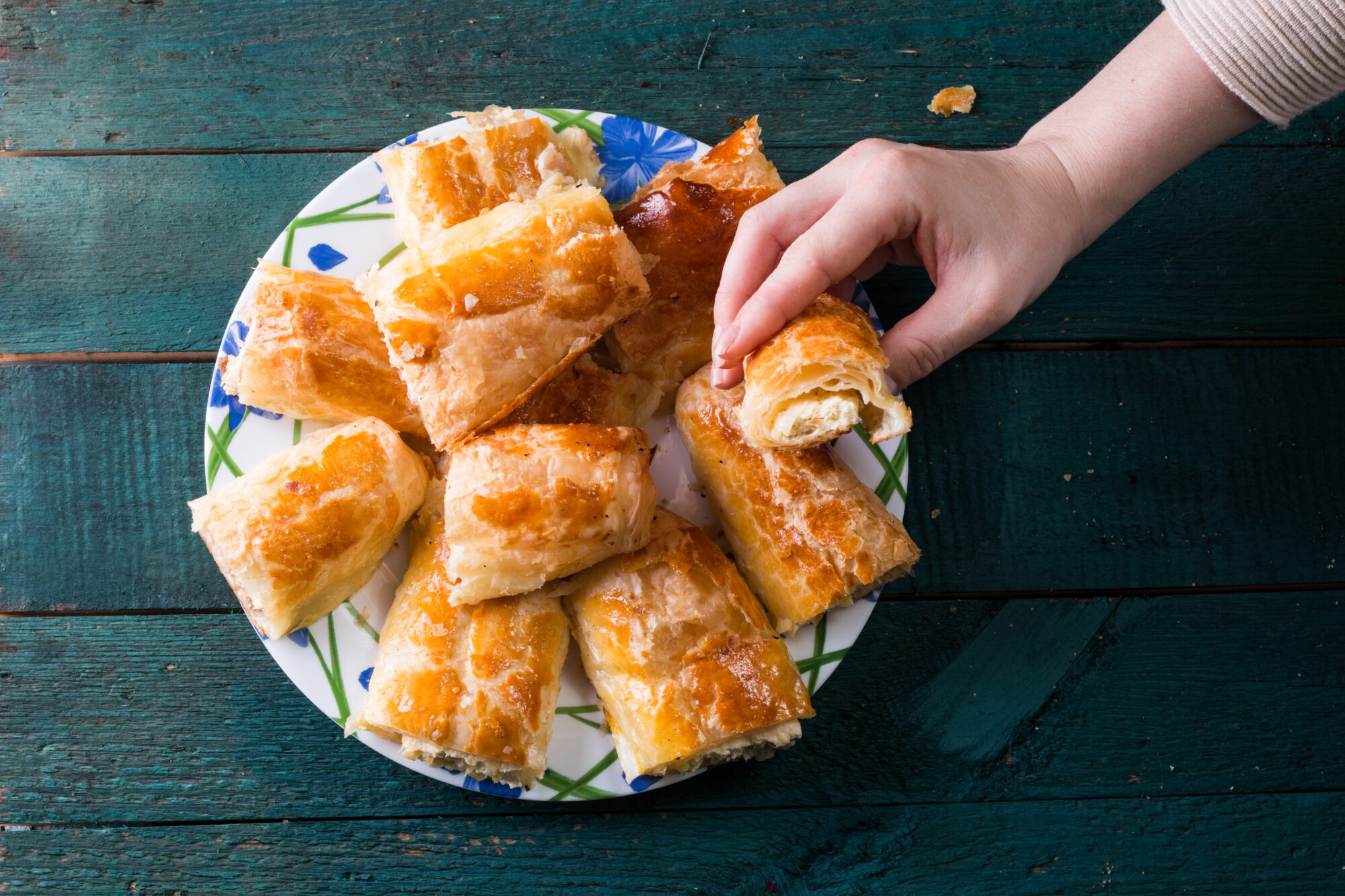 Proceed by cutting 10-12 cm wide strips and spreading the stuffing (cow cheese mixed with scallions, salt and one egg) and sticking the ends and the edges, so the stuffing won’t leak.