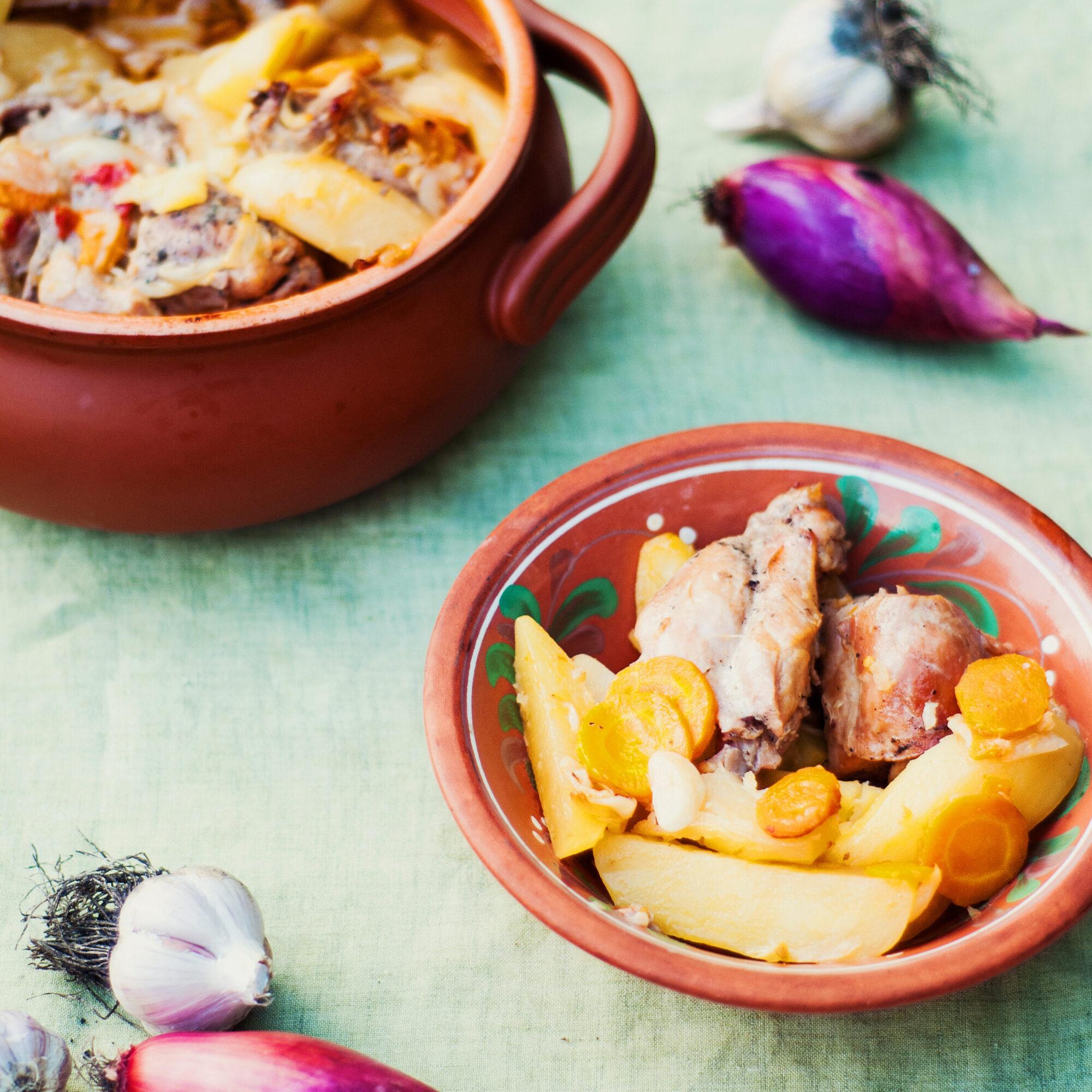 Add some bay leaves, peppercorns and slightly crushed garlic cloves on the bottom of a clay pot.